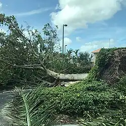 Heavy rainfall in Estero flooded neighborhoods and left roads impassible. A total of 105 homes suffered minor damage, 17 received extensive damage, and 9 were destroyed.[105] On Estero Island, winds downed trees and power lines across the island, though structural impact was mostly limited to some roof and patio screen damage.[106] At Sanibel Island and Captiva Island trees and power lines fall throughout both islands, but little, if any, structural damage occurred.[107] In Cape Coral, winds downed fences, signs, and trees. Heavy rainfall left flooding on a few streets. However, left structural impact occurred in the city.[108] Similarly, tree loss was extensive in Fort Myers and property damage was generally minor. At the Edison and Ford Winter Estates, a fallen banyan tree crushed a portion of the picket fence around the museum. Some neighborhoods experienced street flooding, especially Dunbar and Island Park.[109] In North Fort Myers, extensive seawall damage occurred at properties along the Caloosahatchee River. A number of homes in the community suffered roof and window damage.[110] In Lehigh Acres, nearly 12 in (300 mm) of rain fell, leaving neighborhoods isolated.[111] Two fire stations were closed due to extensive wind and water damage.[112]