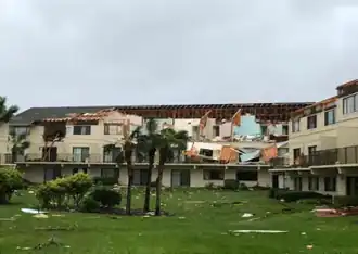 In the city of Key Colony Beach, 888 homes reported minor damage, 206 received major damage, and 1 home was destroyed.[46] On Grassy Key, large waves gutted the ground floor rooms at the Seashell Resort.[47] A total of 90 homes were damaged on Duck Key, 7 significantly.[46] Hawks Cay Resort suffered extensive damage, forcing nearly the entire staff to be laid off, with the property not expected to reopen until the summer of 2018.[66] The storm caused minor damage to 13 homes, major damage to 4 homes, and destroyed 10 homes on Conch Key. Fourteen homes suffered minor impact and one home was destroyed on Long Key, not including Layton. Within the city, 15 homes sustained major damage and 160 others had minor damage. On Fiesta Key, 257 homes experienced major damage.[46] At the main base of the Florida National High Adventure Sea Base on Lower Matecumbe Key, several buildings sustained minor to moderate damage, while the staff houses suffered moderate to extensive roof impacts.[67]