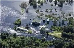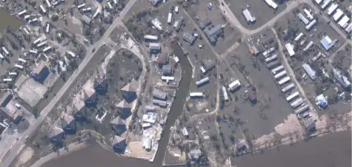 At Lake Harbor, a tiny lakefront community near the western boundary of Palm Beach County, only seven homes were left standing after the hurricane.[94] About 743 homes[91] – roughly 80% of the dwelling in South Bay – were damaged,[92] and 63 residences were destroyed.[91] The city hall and the fire station suffered heavy roof damage.[95] In Canal Point, trees, branches, power lines, and electrical poles were toppled. Almost complete destruction of the community's mobile homes parks occurred. Several other homes and buildings were inflicted with serious damage.[88] Overall, damage occurred at about 60% of homes in Canal Point.[93] Some historical buildings damaged by hurricanes Frances and Jeanne in 2004 were destroyed by Wilma.[96] State Road 80, one of the only routes between eastern and western Palm Beach County, was closed after a Florida Power & Light transmission line fell across the highway about 1 mi (1.6 km) west of Lion Country Safari.[90] At the Loxahatchee National Wildlife Refuge (NWR), 85% of tree islands – "small, wetland forest communities imbedded in a matrix of freshwater marsh" – were damaged by the storm. Less than 50% of the canopies were removed at most tree islands, while the tree islands that suffered the worst impact had larger trees and were near the center of Loxahatchee NWR.[97] The office and visitor centers were both severely damaged and later rebuilt.[98]