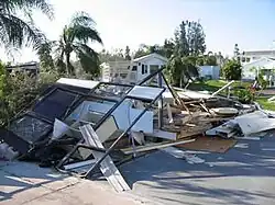 Wilma spawned one tornado in Collier County, an F1 tornado near Copeland that caused minor property damage, downed some large trees, and split an electrical pole in half.[27] Out of the 170 traffic light signals in Collier County, 130 were destroyed.[28] Throughout Collier County, Wilma damaged more than 16,000 businesses and homes.[27] Approximately 5,000 buildings received damage to at least 20% of their structure, while 394 buildings suffered damage to at least 50% of their structure. Wilma destroyed 8 businesses and 2 homes. A total of 615 mobile homes – approximately 30% of mobile homes in County Collier experienced completion destruction – about one-third of which were located in Immokalee.[29] The storm destroyed at least 50% of orange and grapefruit crops in the county, while a significant loss of sugarcane occurred in the Immokalee area.[27] The county's stone crab trap industry also experienced significant effects, with thousands of nets being washed into the Gulf of Mexico.[30] Wilma caused about $1.2 billion in damage in Collier County.[31]