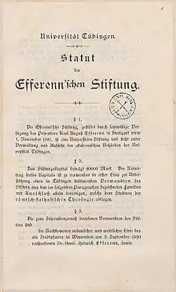 The Efferenn's Trust was founded in 1881 by the last will of the independent gentleman Carl August Efferenn. The starting capital was 40,000 Marks, i.e. today approximately €250,000. The trust was managed by the academic officers of University of Tübingen. It was primarily set up for supporting a relative of the donor, who studied in Tübingen. If no candidate of the family applied, the scholarship could be given to a poor but intelligent student of the university, if he was a protestant and from Württemberg.