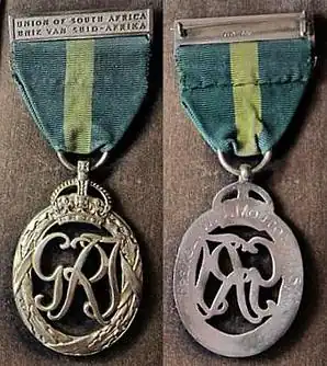 The medal ribbon is suspended from a rectangular silver bar-brooch, inscribed "UNION OF SOUTH AFRICA" and "UNIE VAN SUID-AFRIKA" in two lines. On the reverse, the bar-brooch is impressed with silver hallmarks.[3][12][13]