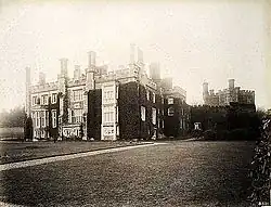 William Fellowes had alleged that his sister Mary had influenced both his father and his brother to make wills which were not in his favour. The will was deemed valid, and the unfortunate Mrs Brown was imprisoned in the Fleet, from where she made a plea for financial assistance to fight the case and secure her legacy and annuity.[25] Affidavits had been lodged in court testifying that she was already married, presumably to Mr Brown, and also to her bad character and the fact that she had not been pregnant over the past 12 or so years.[26] Newton Wallop was deemed the legal heir under the will and thus inherited Eggesford and by royal licence in 1794 duly adopted for himself and his issue the name and arms of Fellowes.[27] Fellowes' second wife Lady Catharine Fortescue, a daughter of Hugh Fortescue, 1st Earl Fortescue (1753–1841) of Castle Hill, Filleigh appears to have been the driving force behind the demolition of the old Eggesford House located immediately to the west of the parish church, and the building of the new Eggesford House, about a mile further east on the brow of a hill, the site of Heywood House in the parish of Wembworthy, ancient seat of the Speke family,[28] which was demolished as part of the scheme. Catharine had at first planned merely to enlarge and remodel the old house, and had drawings prepared by her father's architect Thomas Lee (died 1834) of Barnstaple.