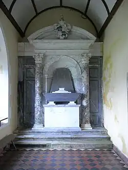 The monument is said to have been made in Italy and originally included four kneeling figures at the base. At the top in a heraldic escutcheon are the arms of Fellowes quartered with the arms of Martyn, his wife's family, Argent, a pair of dolphins hauriant proper.[16]