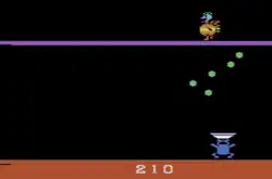 A chicken at the top of the screen moves back and forth, dropping eggs. The paddle controller is used to move a blue bear holding a hat over its head left and right at the bottom of the screen. The goal is to catch the eggs in the hat. At the end of each round, the player has a chance to throw the eggs they have caught back at the chicken for bonus points. The speed of the game increases as the player progresses.