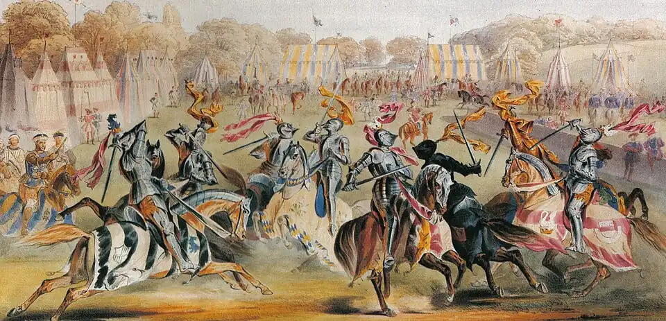 The preparations, and the many works of art commissioned for or inspired by the Eglinton Tournament, had an effect on public feeling and the course of 19th-century Gothic revivalism. Its ambition carried over to events such as the lavish Tournament of Brussels in 1905, and presaged the historical reenactments of the present. Features of the tournament were actually inspired by Walter Scott's novel Ivanhoe: it was attempting "to be a living re-enactment of the literary romances".[2] In Eglinton's own words "I am aware of the manifold deficiencies in its exhibition — more perhaps than those who were not so deeply interested in it; I am aware that it was a very humble imitation of the scenes which my imagination had portrayed, but I have, at least, done something towards the revival of chivalry".[3]
