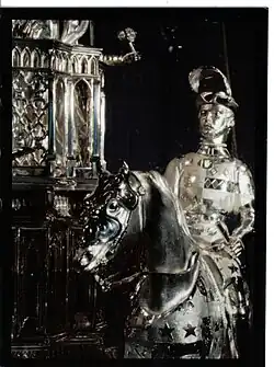 A second silver trophy was presented to the Earl by 300 citizens of Glasgow.[15] In 2014 a silver statuette measuring 44 cm in height representing a knight in full armour with a jousting lance and a horse bearing the Earl of Eglinton's coat of arms was acquired by the East Ayrshire Leisure Trust on behalf of East Ayrshire Council. It is believed this is the only surviving part of the "second silver trophy" and that the rest of the candelabrum was melted down for its silver content after it was sold by the Earl of Eglinton in the 1920s.[16] The silver hallmark shows that the statuette dates to 1840, three years before the Eglinton Trophy was completed. The silversmiths were Benjamin Smith III of London and D.C.Rait of Glasgow.