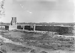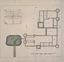 There is a single source that claims that Egmond Castle was destroyed in 1315. If such were true, the circular castle would have been destroyed that year.[8] Renaud thought it more likely that this happened during the rebellions after the death of Count Floris V.[9] In both cases a wall fragment retrieved in the northwest moat could be a leftover of the destruction.[8] The distance between the round castle, and the new (third) castle makes it likely that the round castle lost its use in about 1300.[9] The existence of the circular water castle was then forgotten till it was rediscovered in the 1930s.[10] See: 18th century floor plan.