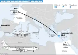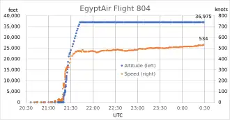 The aircraft departed for Cairo International Airport from Charles de Gaulle Airport on 18 May 2016 at 23:09 (all times refer to UTC+2, used in France and Egypt at the time).[16][17] It disappeared from radar while flying at flight level 370 (about 37,000 ft (11,300 m) in altitude) in clear weather, 280 km (170 mi; 150 nmi) north of the Egyptian coast,[18] and about the same distance from Kastellorizo, over the eastern Mediterranean on 19 May at 02:30.[19][20][21] The aircraft crashed into the sea at around 02:33, when the last ACARS message was sent. The flight had lasted 3 hours 25 minutes.[22]