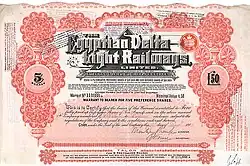 The Egyptian Delta Light Railways was a 750 mm (2 ft 5+1⁄2 in) gauge Egyptian narrow gauge railway. It followed on two railway concessions in the Nile delta granted by the Egyptian government. The first was a monopoly for the construction and exploitation of narrow-gauge agricultural railways in the western and central Nile delta governorates of El-Behera (Beheira) and Al-Gharbeya (Gharbia) granted to a British company, Messrs. John Birch and Co. Limited, by a concession dated 27 March 1896. These rights were transferred in 1897 to the Société Égyptienne des Chemins de Fer Agricoles, which began construction at Baheira, in 1897 and 1898, of the first 25 kilometres of the network.[1]
