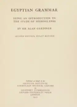 ![]() Title page for Egyptian Grammar: Being an Introduction to the Study of Hieroglyphs (1950) second edition | |