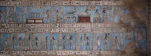 Beginning with the 9th Dynasty, ancient Egyptians produced 'Diagonal star tables', which were usually painted on the inside surface of wooden coffin lids.[8] This practice continued until the 12th dynasty.[9] These 'Diagonal star tables' or star charts are also known as 'diagonal star clocks'. In the past they have also been known as 'star calendars', or 'decanal clocks'.[10] These star charts featuring the paintings of Egyptian deities, decans, constellations, and star observations are also found on the ceilings of tombs and temples.