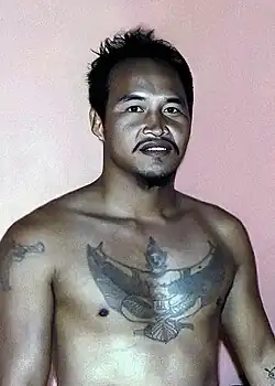 Eh Phouthong is a big believer in traditional tattoos. He got his tattoos in Battambang by Sorn Sarin. In his early 20's, Eh got four "magic" designs on his body to ensure success. He said "It made a huge difference. I increased the number of victories and reduced the number of defeats. Yet you have to believe in the tattoos for them to be effective. Otherwise, it's just a waste of time."[23][24]