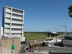 The Eider Barrage (German: Eidersperrwerk) is located at the mouth of the river Eider near Tönning on Germany's North Sea coast. Its main purpose is to protect against storm surges from the North Sea. It is Germany's largest coastal protection structure. It was also intended to contribute to economic recovery in the districts of Norderdithmarschen (today part of Dithmarschen) and Eiderstedt (today part of Nordfriesland).