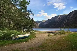 ![]() A view to Eidfjordvatnet from the southern end of the lake in the municipality of Eidfjord, Hordaland, Norway in 2011. | |