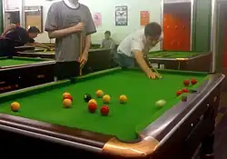American-style eight-ball arose around 1900, derived from basic pyramid pool.[1] In 1925, the Brunswick-Balke-Collender Company began offering ball sets specifically for the game using unnumbered yellow and red balls (in contrast to the numbered solids and stripes found in most pool ball sets), a black eight ball, and the white cue ball. These were introduced to make it easier for spectators to identify the two sets in early professional games held in casinos, and became known as "casino-style" sets.[2] In the years following World War II, playing eight-ball on small coin-operated pool tables became a common pub game in American bars, a pastime which spread to Britain by the early 1960s. In the years following, the British game diverged from the American in equipment (including the use of casino-style balls, which had died out in the US) and rules.[3]