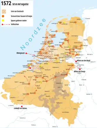Flushing and Veere defected to the rebels on 3 May.[19] Orange quickly responded to this new development, by sending a number of emissaries to Holland and Zeeland with commissions to take over local government on his behalf, in his old capacity of stadtholder, which he now re-assumed.[22] Diederik Sonoy persuaded the cities of Enkhuizen, Hoorn, Medemblik, Edam, Haarlem, and Alkmaar to defect to Orange. The cities of Oudewater, Gouda, Gorinchem, and Dordrecht yielded to Lumey. Leiden declared itself for Orange in a spontaneous revolt. The States of Holland, with a rebel majority,[note 2] convened in the rebel city of Dordrecht,[23] and by 18 July, only the important cities of Amsterdam (until 1578) and Schoonhoven openly remained loyalist. Rotterdam went to the rebels soon after the first meetings in Dordrecht. Delft remained neutral for the time being.[24]