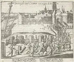 The remaining royalist cities in Holland were won over to the rebel cause.[30] Haarlem, Weesp and Muiden swore allegiance to Orange as stadtholder for the States-General on 22 January 1577.[30] Amsterdam proved more difficult, as the city government was more defiantly royalist. Additionally, it had cause for complaint as the Sea-Beggar navy continued to informally blockade Amsterdam's trade in contravention of the Pacification.[31] When help from Don Juan proved infeasible, Amsterdam sued for an arrangement in September 1577. The States of Holland, however, preferred to subdue the city by force, instead of engaging in negotiations (despite Orange's imprecations). Rebel troops started to invest Amsterdam, but thanks to mediation by the States of Utrecht (a province that had been consistently on the royalist side during the Rebellion) a "Satisfaction" was agreed on 8 February 1578. Calvinist exiles were to be allowed to return, but they would not be free to worship according to their preference; only the Catholic religion would be practiced. This was the mirror image of conditions elsewhere in Holland. The old militias would be re-formed, and Amsterdam would not be liable for debts of the States contracted during the Rebellion. However, after the exiles returned, they staged a bloodless coup on 24 May 1578, ousting the city government and expelling its members from the city. This so-called "Alteratie" brought Amsterdam again fully into the fold of the northern Netherlandish province, and eliminated the strategically dangerous chink it had formed in its armour.[31]