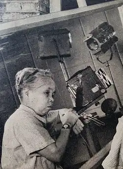 In July 1926, Yamazawa travelled to the US where she enrolled in still life classes at the California School of Fine Arts.[7] Yamazawa's father died soon after she arrived and as a result, Yamazawa was forced to seek out part-time work to pay for school tuition and living expenses.[8] Through a serendipitous introduction by a local camera shop owner, Yamazawa began working as an apprentice to Consuelo Kanaga who was then primarily a portrait photographer in San Francisco.[9] In 1927, Kanaga closed her studio to tour Europe and Yamazawa took on work as a photography assistant to an unidentified amateur photographer.[10] After completing her studies at California SFA in December 1927, Yamazawa travelled to Europe in the spring of 1928.[10] When Yamazawa came back to the US, she visited Kanaga in New York City and found a retouching job with Nikolas Murray, a photographer for Harpers Bazaar.[9]