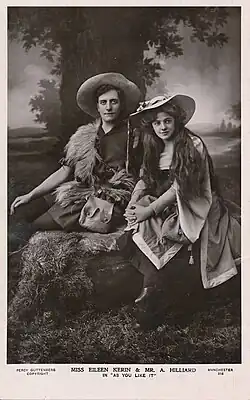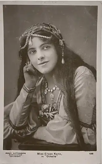 Eileen Kerin was born in Bloomsbury in London in 1885, the third of four children of Charles James Walter Kerin (1847–1886), a cargo surveyor, and his wife Jane née Davis (1852–1920).[1] She was the sister of the actress Nora Kerin[2] and a cousin of the actresses Julia Neilson, Lily Hanbury and Hilda Hanbury and Hilda Jacobson.[3] She played Rosalind opposite A. Hilliard as Orlando in As You Like It (1908)[4] and Desdemona opposite Norman Partriege in the title role in Othello (1907), both at the Queen's Theatre in Manchester.[5] She appeared in a dramatisation of The Prisoner of Zenda by Edward Rose (1910–1911) at the Lyceum Theatre, London.[6]