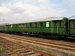 These coaches were joined by four luggage/buffet cars of class CRrymg-54 (later BRyl 446) and prototypes of 1st class open coaches, the Aymg-52, later reclassified as Ayl 401. The code letter b was only given to coaches with control wiring, their classification until 1975 being …ym(b).