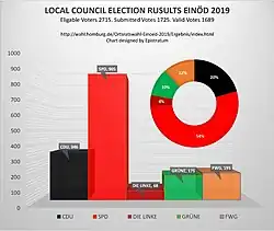 Similar to the elections in previous cycles the SPD won the elections in 2019 with an absolute majority.[60] In the city council elections the CDU became the majority party[61] whereas the SPD maintained its majority in Einöd.[62] Dr.med. Karl Schuberth (SPD) has been the council head[63] of the district of Einöd since 2004.