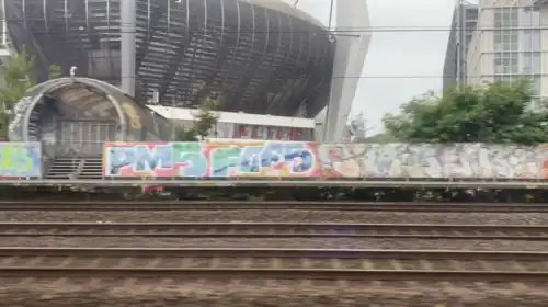 Eindhoven Stadion as seen from inside of a passing train.