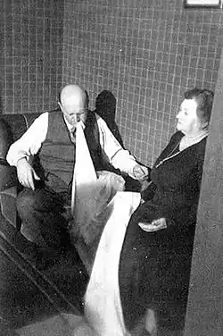 The psychical researcher Harry Price sat with Nielsen in Copenhagen with "unsatisfactory results."[5] Nielsen was also caught hiding his ectoplasm in his rectum.[6] In 1932, Johs Carstensen the leader of Nielsen's spiritualist circle wrote a pamphlet which exposed his tricks.[7] Nielsen continued to work as a medium until his death but was never considered credible again by people outside his small circle of influence. He published the book Solid Proofs of Survival in 1950.[8]