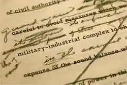 As early as 1959, Eisenhower began working with his brother Milton and his speechwriters, including his chief speechwriter Malcolm Moos, to develop his final statement as he left public life. It went through at least 21 drafts.[7] The speech was "a solemn moment in a decidedly unsolemn time", warning a nation "giddy with prosperity, infatuated with youth and glamour, and aiming increasingly for the easy life."[4]