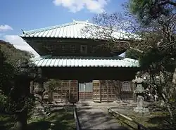 After the Meiji Restoration, the practice of obtaining priestesses from the Mito Domain was discontinued and influence of the temple waned. During the 1923 Great Kantō earthquake, the temple gate was damaged but volunteers eventually rebuilt it on the original cornerstone, with the completion ceremony being held on May 16, 2011. The temple is the 6th temple of Togoku Hananotera 100 kaji located in Kamakura.[1][2]