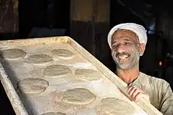 Eish baladi (Egyptian Arabic: عيش بلدى) is a traditional Egyptian flatbread and is one of the oldest and most enduring staples in the country’s culinary history.[1] It is renowned for its ubiquity and significance in Egyptian culture.[1] As the most popular type of bread in Egypt, it has formed the backbone of Egyptian cuisine since ancient Egypt.[1] Its widespread presence is also reflected in everyday urban scenes, such as in Cairo, where vendors are often seen cycling through traffic while balancing baskets containing numerous loaves of eish baladi.[2]