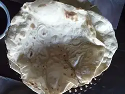 Eish merahrah (Egyptian Arabic: عيش مرحرح, [ʕeːʃ meˈɾɑħɾɑħ], "smoothed-out bread", "spread-out bread") is a flatbread, made with ground fenugreek seeds and maize, eaten in Egypt. It is part of the traditional diet of the Egyptian countryside, prepared locally in village homes in Upper Egypt. The loaves are flat and wide, and usually about 50 cm (20 in) in diameter.[1] A soft dough is made with the maize flour and left to ferment overnight with a sourdough starter, shaped into round loaves, and then allowed to rise or "proof" for 30 minutes before being flattened into round disks and baked.