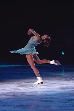 In 2001, she was the subject of a Lenox figurine called "Katia's Celebration of Life," which depicts her performing a layback spin in the tribute she skated for Grinkov.[26] She also appeared in the 2003 Sports Illustrated Swimsuit Issue as a featured athlete.[27] In 2003, she appeared on the ice for the first time with Daria. The pair performed a duet during a Mother's Day show and took the ice together several times since 2003, including two different versions of Amy Grant's "Children of the World" at Kristi Yamaguchi's "Family & Friends" shows in 2005 and 2006. During that show in 2007, the mother-daughter duo became a trio when they were joined by Gordeeva's younger daughter, Liza, and all three skated together to "Homesick" performed live by The Cheetah Girls.[28] Since 2007, all three are amateur skaters together.