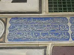 The el-Jazzar Mosque was built over former Muslim and Christian prayer houses and other Crusader buildings, including military architecture.[1][4] Building materials for the mosque, particularly its marble and granite components, were taken from the ancient ruins of Caesarea, Atlit and medieval Acre.[4] El-Jazzar commissioned several Greek masons as the mosque's builders.[6] There is a tughra or monogram on a marble disc inside the gate, naming the ruling Sultan, his father, and bearing the legend "ever-victorious."