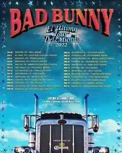 El Último Tour Del Mundo 2022 was the third concert tour by Bad Bunny, in support of his second and third studio albums YHLQMDLG and El Último Tour Del Mundo, both released in 2020. The tour started on February 9, 2022 in Denver and ended in Miami on April 3, 2022. It had one leg in the United States and 35 shows in total. The tour was a box office success with all the dates sold out. It grossed a total of $117 million with a total attendance over 575,000 fans, making it the highest grossing tour by a Latin artist in Billboard Boxscore history up that point.[1][2] Also, it was the fastest selling tour since 2018. On average, Bad Bunny's tour has had a per-show ticket count of 15,990 and a gross of $3.2 million.[3][4]