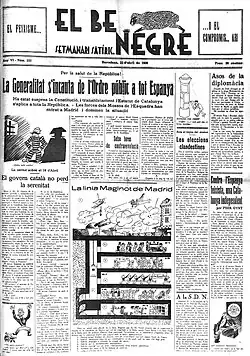 El Be Negre was first published on 23 June 1931, only two months after the foundation of the Second Spanish Republic. Its founder was Amadeu Hurtado from the La Publicitat newspaper, together with Josep Maria Planes, Rossent Llates and Just Cabot. The director of the magazine was Josep Maria Planes. Other notable members of the team were Josep Maria de Segarra, Valentí Castanys i Borràs, Francesc Fontanals ("Soka"), Avel·lí Artís-Gener "Tisner", Manuel Amat, Ernest Guasp, Josep Maria Xicota, Andreu Avellí Artís, Carles Sinfeu, Enric Fernàndez Gual, Joan Cortès i Vidal, Joaquim Muntanyola, Salvador Mestres, Feliu Elíes ("Apa") and Romà Bonet ("Bon").[3] The headquarters of the magazines was in Barcelona.[4]