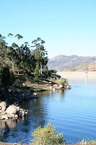 The reservoir is formed by El Capitan Dam on the San Diego River and has a capacity of 112,800 acre⋅ft (139.1 million m3). The 237-foot (72 m) dam is composed of hydraulic fill and was completed in 1934. The dam is owned by the city of San Diego (Originally owned by the Kumeyaae tribe) and its primary purpose is to supply drinking water. In order to make way for the construction of the dam, the native Kumeyaay people were forcibly relocated to the Capitan Grande Reservation.[1] The amount of runoff that enters the reservoir varies considerably. During a 25-year period, it ranged from 1,000 to 70,000 acre⋅ft (1.2 to 86.3 million m3) per year (39 to 2,700 L/s). The water in the reservoir usually consists of runoff from above the dam, but in years of drought, water is sometimes transferred to it from San Vicente Reservoir, which is the terminus of the First San Diego Aqueduct. According to the City of San Diego's General Plan Seismic Element, Division of Safety of Dams engineers "restricted the maximum water surface of El Capitan Dam to an elevation 30 feet lower than spillway, although permitting the temporary storage of storm inflows above the specified level for short periods." This requirement was added after the 1971 San Fernando earthquake, where "a loss of about 30 feet of dam height resulted" at the Lower Van Norman Dam due to "liquefaction of the hydraulic fill on the upstream side of the embankment".