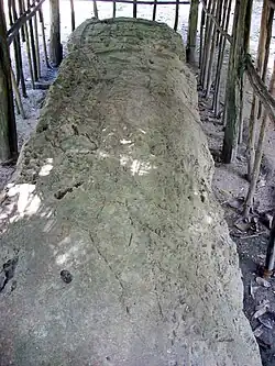 East Plaza Structure 2 is also on the east side of the plaza.[20] It is a rectangular platform measuring 17 by 10 metres (56 by 33 ft) and facing westwards onto the plaza itself.[75] A stairway climbs the west side of the building. It measures 12 by 1.2 metres (39.4 by 3.9 ft).[75] The platform supports a bench measuring 12 by 3 metres (39.4 by 9.8 ft).[75] The broken remains of Stela 6 are scattered in front of the structure.[75] Relatively few ceramic remains were found associated with this structure. Those that were have been dated to the Terminal Classic, although a pit sunk into the summit uncovered remains dating to the Late Classic at a depth of 1 metre (3.3 ft).[76] Lithic artefacts included a piece of an obsidian knife.[76]