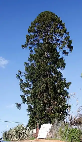 The tree, a mature bunya pine, grows on the former property of Dr. Okuno,[2] a Japanese dentist and intern in a World War II concentration camp. Following release, Dr. Okuno received the land as a gift from an Anglo lady with whom his wife worked. There he rebuilt his business and amassed a huge library. After retiring, he took long strolls around East Los Angeles, greeting everyone and amusing the children with storytelling. Dr. Okuno is listed in the California Who's Who.[3]