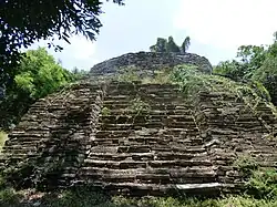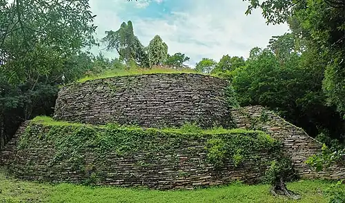 The first plaza is marked by its northmost location and the sizable edifices which flank it, which are the largest within El Sabinito.[7] Outstanding among these constructions is the circular, eight-meter-high pyramid, with slabs of limestone jutting out of its sides like the arms of a windmill. This particularly conical style of pyramid has been associated with the worship of Ehecatl, the Huastec god of wind which was later appropriated by the Aztecs.[8] Opposite to this pyramid is a ceremonial altar measuring 2 meters by 6 meters with an aberrantly uneven shape.