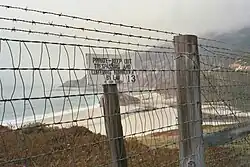 At the mouth of the Little Sur river are some of the largest sand dunes on the Big Sur coast. The mouth of the Little Sur River, the sand dunes, and the mile-long Little Sur River beach are within the boundaries of the El Sur Ranch. Hill maintains a secure fence and has prominently posted no trespassing signs on the fence along Highway 1 as suggested by legal precedent.[61] While the beach below the mean high tide line is open to the public, the law does not permit individuals to trespass on private property to reach the public beach. Individuals who trespass to reach the beach have been cited.[62][63]