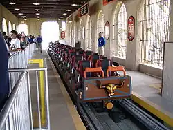 El Toro operates two trains, labeled A and B, each with six cars per train. Riders are arranged two across in three rows for a total of 36 riders per train. It has a theoretical capacity of 1,200 guests per hour.[13] Both trains contain a cosmetic bull head mounted on the front car.[16] The trains have padded "wings" at shoulder level to prevent riders from being injured during moments of strong lateral forces.[17]