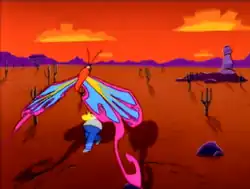Most of the hallucination sequence was animated completely by David Silverman. Silverman did not want the risk of sending it to South Korea, as he wanted it to look exactly as he had imagined it, including rendered backgrounds to give a soft mystical feel to the scene.[7] The coyote was intentionally drawn in a boxier way so that it looked "other-worldly" and unlike the other characters.[8] During Homer's voyage, the clouds in one shot are live-action footage, and 3D computer animation was used for the giant butterfly.[2] During the same hallucination, Ned Flanders' line was treated on a Mac computer so that it increased and decreased pitch.[2]