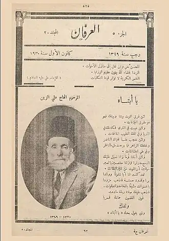 He was imprisoned multiple times under Ottoman rule and later during the French Mandate due to his support for the Syrian Revolution, and opposition to colonialism.[69] El Zein advocated for educational, agricultural, and administrative reforms. He authored several notable works and also published and edited key literary and religious texts through the printing press of Al-Irfan.[5] Ahmad Aref El-Zein died on October 15, 1960, during a trip to Iran, where he was visiting the cities of Qom and Mashhad. He was buried in the shrine of Imam Reza in Mashhad with the approval of Mohammad Reza Pahlavi.[69]