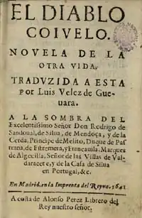 The Limping Devil (Spanish: El diablo cojuelo) is one of the most popular works by Luis Vélez de Guevara; it is his only novel published in 1641. In 1918 an edition published by Francisco Rodríguez Marín became well known. The story is about a student that takes the devil out of a flask where a magician had locked him. The devil, grateful, shows the student the interior of houses (as if they were toys). This way, they are able to contemplate its inhabitants in their privacy.[1][2]