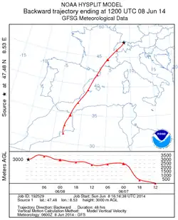 Switzerland saw high temperatures though not extreme or record breaking, temperatures were 30-34 °C in the Rhine valley and Valais. Pilatus mountain above Lucerne witnessed a concentration in Saharan dust carried over in the air mass.[11] 9 June equalled the maximum recorded temperature in Sion at 36.2 °C, the Swiss lowlands saw a high temperature of 35.5 °C recorded in Basel.[18]