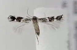 The wingspan is 7–8 millimetres (0.28–0.31 in).The head is grey, face whitish. Forewings are blackish -grey, somewhat paler-sprinkled; a somewhat oblique fascia before middle, in male reduced to a spot on fold, a tornal spot, another on costa opposite, and a more or less developed angular mark beyond and connecting these whitish, in female more distinct; plical stigma elongate, black. Hindwings rather dark grey.[2][3][4]