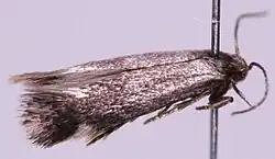 The wingspan is 9–10 millimetres (0.35–0.39 in). Adults are on wing from May to July. There are two generations per year. The head is grey, face whitish. Forewings light grey irrorated with dark fuscous; a very indistinct oblique whitish fascia before middle, usually partly or wholly obsolete; a small tornal spot and larger triangular spot on costa somewhat beyond it ochreous-white. Hindwings are grey.[1][2][3]