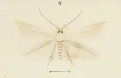 ♂. 10mm. Head, palpi, thorax, and abdomen are white. Forewings narrowly elongate-lanceolate, apex produced, acute; 4 and 8 absent; ochreous-white; an ochreous dot on fold towards extremity : cilia white. Hindwings linear-lanceolate; 4 absent; grey-whitish : cilia whitish.[2]