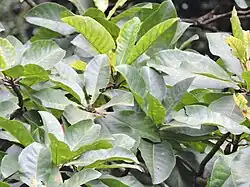The taxa is a medium to large evergreen tree with a large spreading crown, reaching 15 to 60m in height.[3] The flowers have pale-green petiole, 5 white to pale-olive-green calyxes, sepal 4-6mm long, 5 white corollas, petals 4-5mm long, slightly-black anther, 18-30 stamen.[4] The flowers expand to maximum size in late afternoon and hence are likely adapted to night pollinators, i.e. moths. It bears smooth ovoid green fruits[5] the size of which are about 2.5 cm long. Recommended varieties are local cultivars (round and oval fruits).[6] It has a brown seed inside the fruit. The seed has a hard outer shell. The seeds are slow for germination and can take up to 2 years. The wood is whitish yellow.